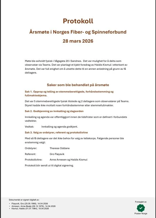 Frist for å melde inn forslag eller saker til behandling på årsmøte er 28. februar. Disse sendes styret på e-post norgesfiberogspinneforbund@gmail.com